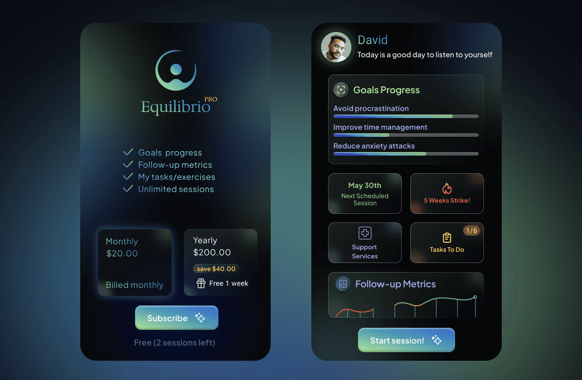 Therapy sessions generate personalized micro-tasks and emotional journaling prompts, transforming insights into habits.