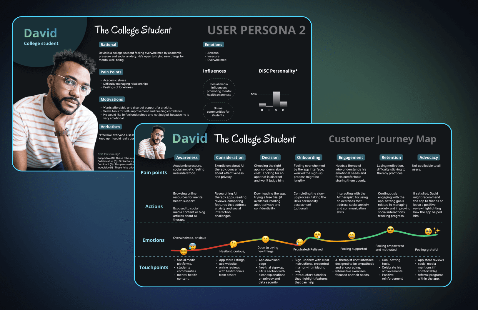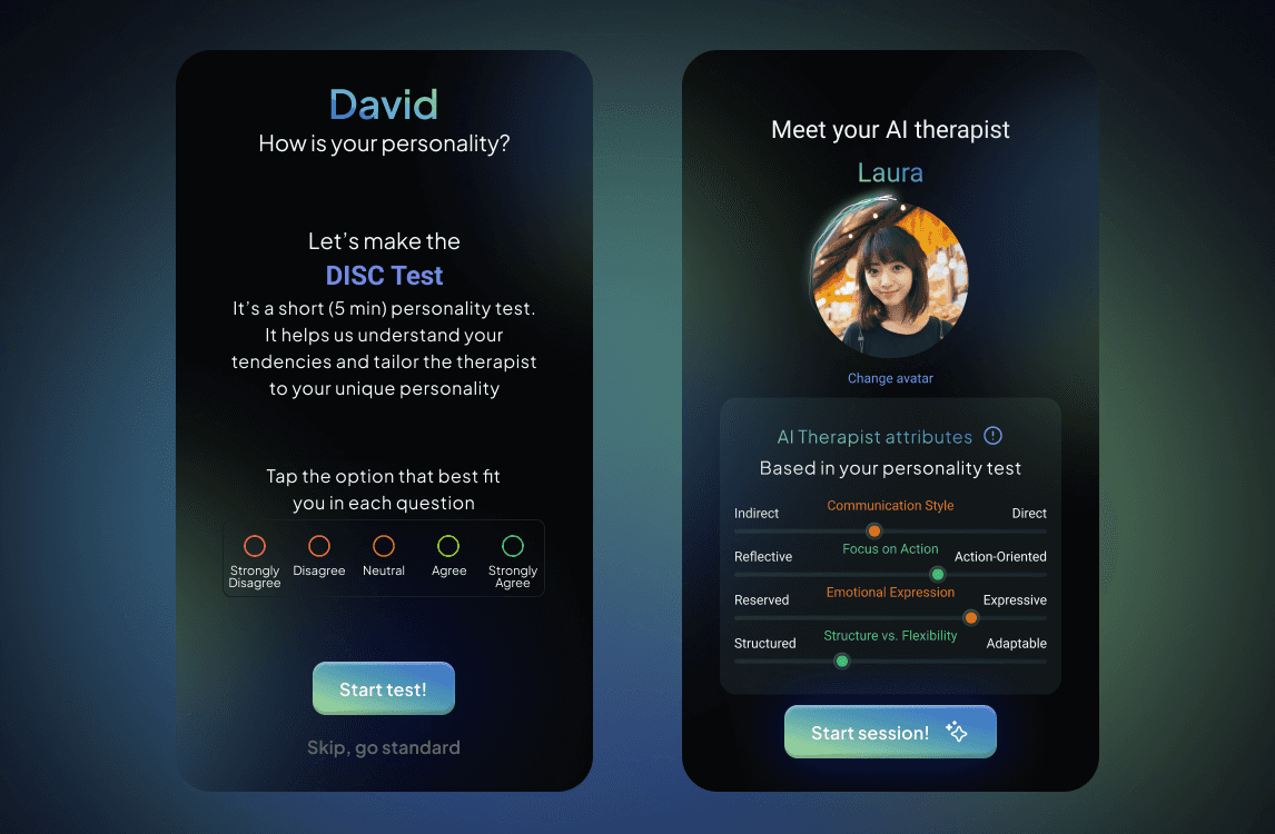 Onboarding integrates a short DISC test to match users with an AI therapist aligned with their communication style.