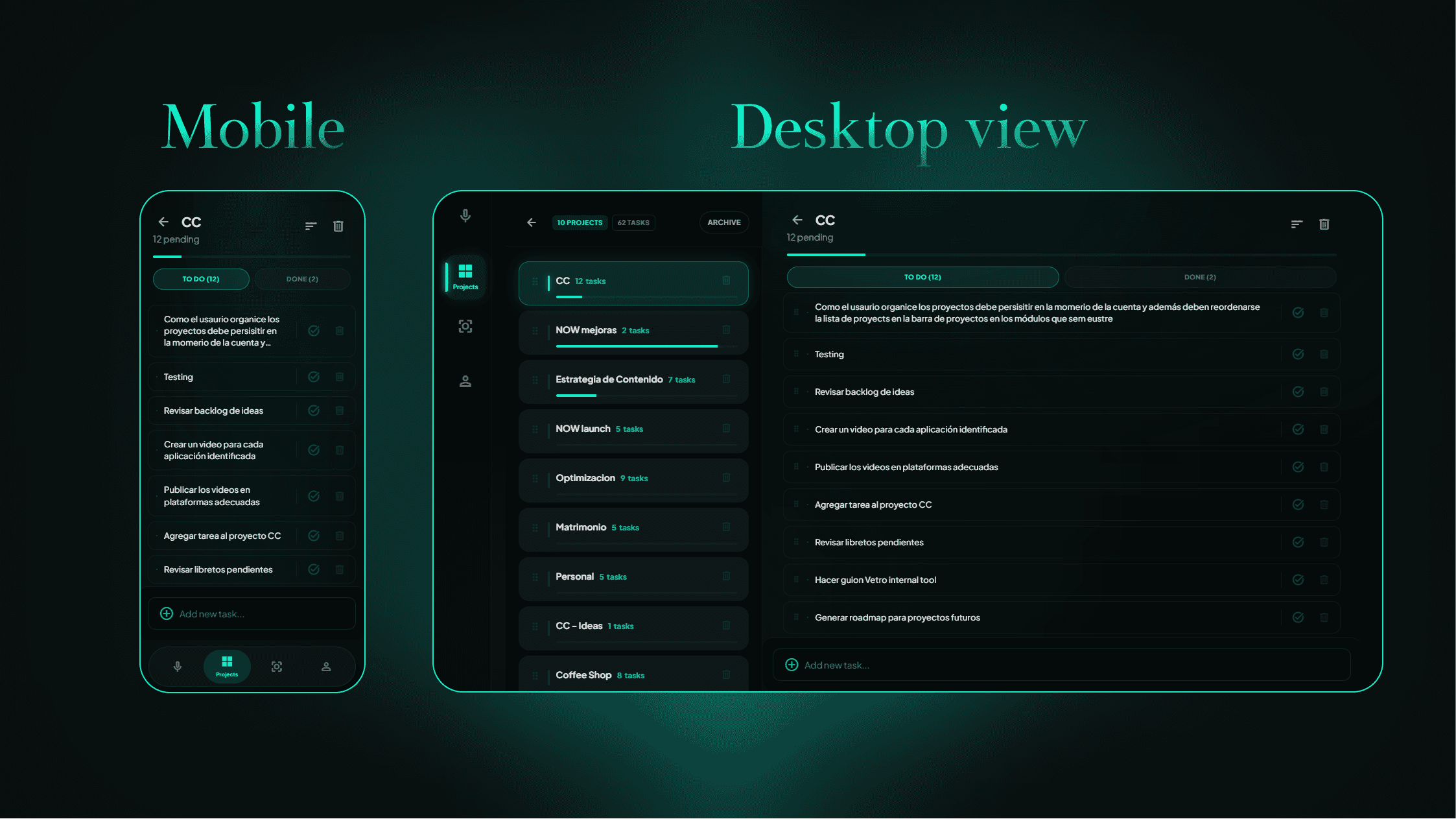 The product was designed as a multi-platform system with a mobile-first capture layer and a desktop workspace layer. Mobile supports quick task capture on the go, while desktop works as a persistent active tab for planning and task management. Layouts adapt to available screen space, showing more context and information density when used on larger screens.
